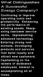 Marketing Energy Based in downtown St. Louis, Ameren's independent energy marketing and trading affiliate has asssembled a seasoned group of more than 50 professionals. The AmerenEnergy team offers a range of experience both in the physical trading of energy and in structuring energy solutions to meet individual business needs. |